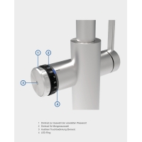 - 6-in-1 C-shape faucet for cold and warm water, chilled still, medium, sparkling or boiling water