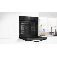 The Constructa Eco-Line built-in oven in black glass design with 7 heating types, Soft-close door and hydrolytic cleaning in the very economical energy efficiency class A+ is made in Europe.
