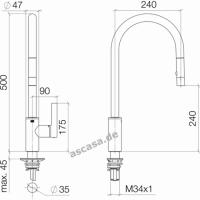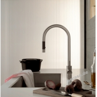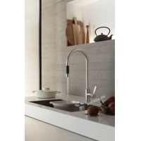The Dornbracht Tara Ultra pull-down single-lever mixer tap is characterized by the shower hose that can be pulled out downwards. The pull-out hose of the Dornbracht-Tara Ultra fitting is easy to use and offers added comfort when working in the kitchen. This means that the shower hose of the Tara Ultra kitchen faucet can be easily guided to the respective location.