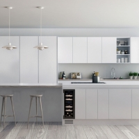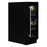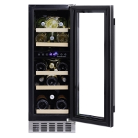 A dual-temperature, 17-bottle undercounter model, 300mm wide, with a sleek exterior and a stainless steel door handle. The DUNAVOX Flow-17 is perfect for modern kitchen environments. The bottles are stored on solid wooden shelves set into a stunning light blue interior. Please note that this model is intended as a base unit.
