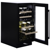 Exterior and a door handle made of stainless steel. This model is perfect for contemporary kitchen environments. The bottles are stored on solid beech wood shelves and are surrounded by warm white, cool white or blue LED interior lighting. Please note that this model is suitable for under-construction and free-standing.