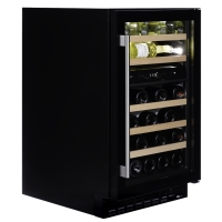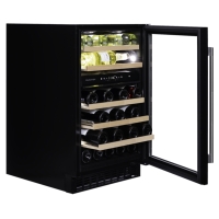 Undercounter model with two temperature zones and a capacity of 38 bottles, an elegant exterior and a stainless steel door handle. This model is perfect for contemporary kitchen environments. The bottles are stored on solid beech wood shelves and are surrounded by warm white, cool white or blue LED interior lighting. Please note that this model is suitable for under-construction and free-standing.