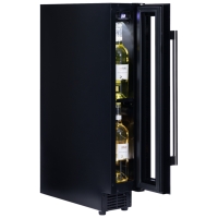 A further development of the DX-7.20 model, which now has a larger capacity of 9 Bordeaux bottles. Available in black and stainless steel. This model is ideal for modern kitchens with limited space. The bottles are stored on fixed shelves embedded in a white-lit interior. Please note that this model is intended as a built-in base unit.
