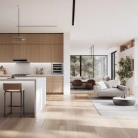 Wine fridge for red and white wine and champagne bottles. Bottles lie on pull-out wooden shelves.