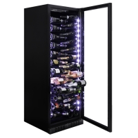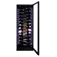 A freestanding and built-in model with a capacity of 143 bottles from Dunavox's exclusive range. The SS model's sleek exterior features a stainless steel handle and the black unit features a black handle. The Sera-143 is perfect for modern kitchen environments, restaurants or hotels. The bottles are stored on patent shelves which are in a stunning light blue, white and amber multi LED interior.