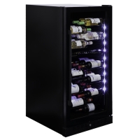 A freestanding, dual-zone model with 58 bottle capacity from the Dunavox Grande family. With its elegant exterior and stainless steel door handle, the SERA-58 is perfect for modern kitchen environments, restaurants or hotels. The bottles are stored on patent racks and are surrounded by warm white, cool white and blue multi LED lighting. Please note that this model is suitable for freestanding or built-in use.