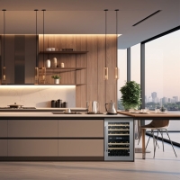 Wine fridge for red and white wine and champagne bottles. Bottles lie on pull-out wooden shelves.