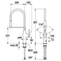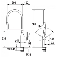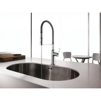 - Single lever mixer. With swiveling spout and spring-guided hose shower (jet/shower switchable), side lever and ceramic cartridge.
