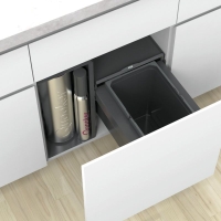 With the Cox Base Q+ 360 S/370-1 waste system, the storage space in the sink cabinet can be optimally organized. Suitable for the Quooker Cube cold water and Pro3 boiling water reservoirs as well as for the 7 liter tanks of the Quooker Combi and Combi+ models. The system can be installed in a kitchen cupboard with a width of 60 cm and a pull-out front. The waste separation system provides a waste container with a volume of 22 liters, making the total volume 22 liters. The housing cover is used as a lid. This can also be used as a shelf. The waste collection system also has a separate frame for the water tank, which can be placed either on the right or left of the cabinet. Hose and cable management is integrated into it for clear storage. The installation frame also makes it easy to change the CO2 cylinder. The waste separation system is easy to operate thanks to full extension technology. The integration of a soft closing mechanism and damping ensures quiet closing. The entire construction is mounted on the cabinet side wall, the base and the front panel.