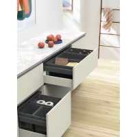 The modern Cox Stand-UP 250 S/800-3 waste separation system was designed for space-saving use in existing pull-outs. It fits effortlessly into wide 800 mm wide base cabinets, even if the siphon and water connections are still behind it. The waste collector consists of 3 containers, each of which holds 1x 10 liters and 2x 13 liters and therefore has a total volume of 36 liters. All garbage containers can be removed individually from the robust frame and transported effortlessly thanks to the folding handles. The entire cover is used to cover it, which can be mounted directly behind the upper front as desired. This can also be combined with the Cox Work utensil box, which is available separately. The built-in waste bin is installed on the pull-out shelf and the front panel.
