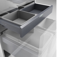 - Waste collector front pull-out system with soft closing and stop cushioning