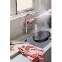 Boiling water in the kitchen is a source of danger. Falling kettles cause hundreds of accidents every year, often involving small children. With the Quooker mixer tap, this is a thing of the past. The Quooker has a child-safe control button and a double-walled tap spout, the outside of which does not heat up. Since it's not a solid jet but consists of droplets, you can pull your hand back before you actually burn yourself. Comfort and safety literally go hand in hand with Quooker fittings.