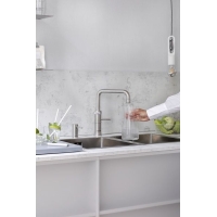 The Quooker Fusion Round is a combination of a boiling tap and a mixer tap with a square spout. It saves time and space, eliminates the use of plastic bottles and is completely safe. To obtain boiling water, press and turn the grooved ring. The light ring now turns red when water boils. It is therefore not possible to accidentally tap boiling water even though you actually wanted to draw chilled water. Incidentally, in standby mode, the energy costs are only around 5 cents per day.