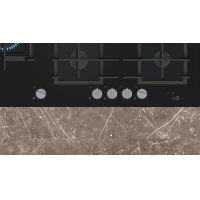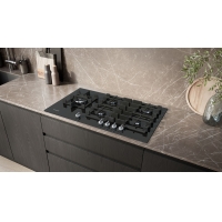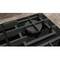 Tempered glass gas hob with stepFlame technology for precise flame control, intelligent automatic extractor, removable sword knobs and semi-continuous pan supports for effortless cleaning.