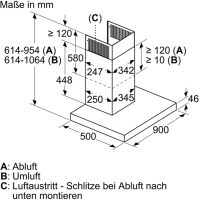- Seadme mõõdud, väljatõmbeõhk (KxLxS): 614-954 x 898 x 500 mm