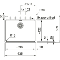 - Väljalõige 615 R x 59 mm, sealhulgas äravooluava