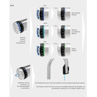 - Нажмите и коснитесь: выбор предварительно заданных типов воды и объемов в мл благодаря колесику масштабирования и интуитивно понятному сенсорному управлению