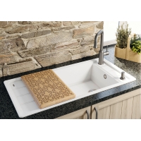 Элементы традиционного стиля в современной интерпретации. Тонкая кромка профиля как элемент дизайна края мойки и разделочной доски. Двойные бороздки подчеркивают характер загородного дома. Просторный бассейн XL. Дополнительная разделочная доска из массива ясеня, также доступная с декоративным декором, может быть размещена по-разному на сушильных досках и раковинах.