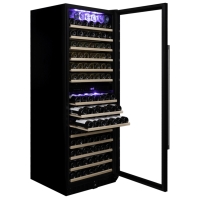 Эксклюзивный очень широкий холодильник для вина с двумя зонами охлаждения. Элегантный внешний вид делает его особенно привлекательным в ресторанах и на современных кухнях. Бутылки хранятся на деревянных полах в помещении с синим освещением. Обратите внимание, что данная модель подходит как для отдельно стоящей, так и для встроенной эксплуатации.