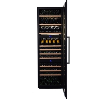 Винный холодильник для бутылок красного и белого вина, а также шампанского. Бутылки лежат на выдвижных деревянных полках.