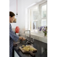 Quooker Fusion Square COMBI — это смеситель с прямым изливом, из которого по желанию течет холодная, теплая или кипящая вода с температурой 100°C. Резервуар COMBI особенно рекомендуется, если в противном случае вам придется долго ждать теплой воды. Резервуар КОМБИ заменяет бойлер или проточный водонагреватель и сразу снабжает вас до 15 литров 60-градусной или до 27 литров 40-градусной теплой воды. Для получения кипятка нажмите и поверните рифленое кольцо. Световое кольцо теперь становится красным, когда вода закипает. Это означает, что невозможно случайно набрать кипящую воду, даже если вы на самом деле хотели набрать холодную или теплую воду. Благодаря запатентованной высоковакуумной изоляции смеситель Quooker потребляет очень мало энергии. В режиме ожидания затраты на электроэнергию составляют всего около 5 центов в день.