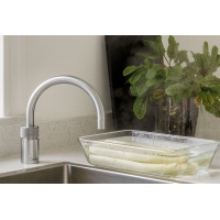 Смеситель Quooker серии Nordic также доступен отдельно, поэтому вы можете комбинировать его с имеющимся у вас смесителем. Подключите Quooker CUBE к резервуару и наслаждайтесь охлажденной, фильтрованной газированной и негазированной водой из одного крана. Новая функция принесет на кухню еще больше радости. Это экономит время и пространство, исключает использование пластиковых бутылок и абсолютно безопасно. Чтобы получить газированную воду, нажмите и поверните ребристое кольцо. Световое кольцо, которое становится красным при закипании воды, теперь мигает синим: приближается газированная вода. Если удерживать кнопку еще немного, из крана потечет стоячая вода, а световое кольцо загорится синим цветом. Поэтому невозможно случайно набрать кипящую воду, даже если вы действительно хотели набрать охлажденную воду. Кстати, в режиме ожидания затраты на электроэнергию составляют всего около 5 центов в день.